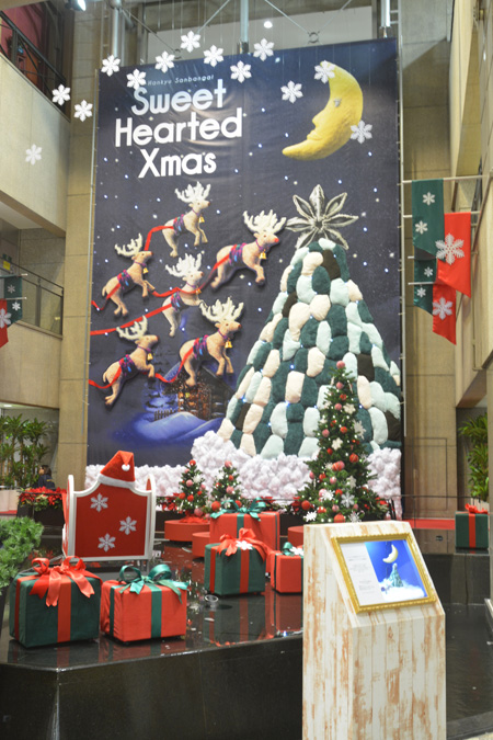 阪急三番街の噴水前広場にての展示になります。トナカイ・月・ツリーがフェルトのイラストになります。トナカイは電気仕掛けでゆらゆらと動きます。 CL 阪急三番街・梅田店さま制作 アド・ウォーク関西支店さま